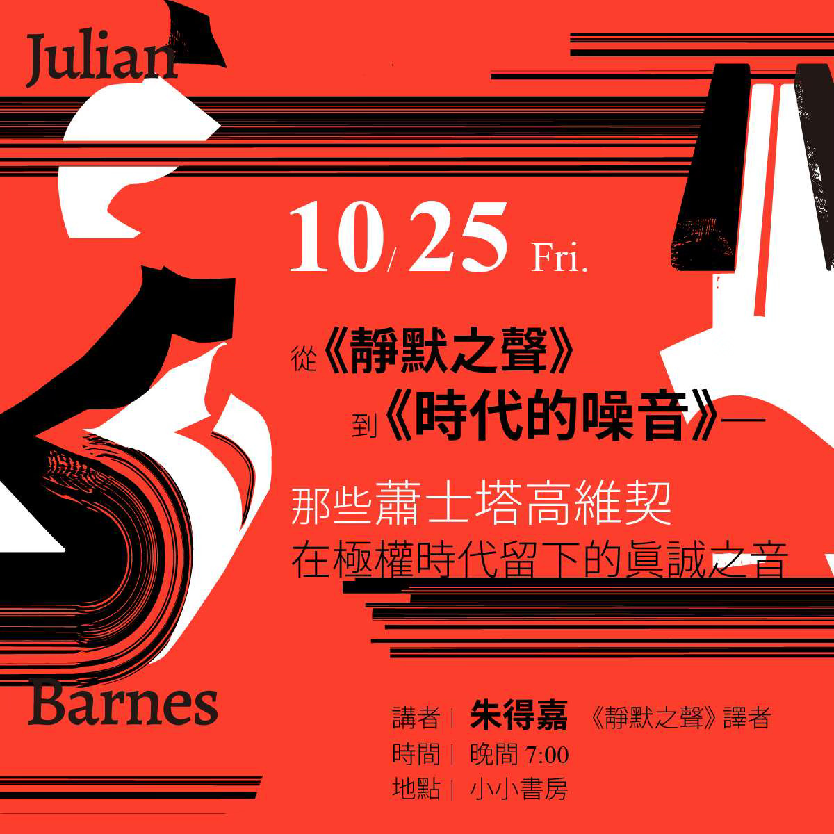 講者將簡介蕭士塔高維奇的生平,並與《時代的噪音》這本小說對映,挑選蕭士塔高維奇的第4、5號交響曲,及第7號《列寧格勒》交響曲,以及歌劇《姆岑斯克縣的馬克白夫人》,《靜默之聲》裡談及的 第3、8、11、13號弦樂四重奏,藉由這些代表性的、或者對比性強烈的音樂,讓讀者能夠感受,書中描述的音樂實際聽起來是什麼感覺。